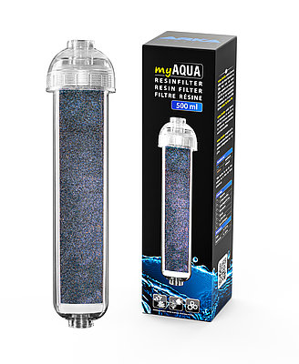 myAqua Resinfilter enthält Kationen- und Anionenharz (H+ und OH- im Verhältnis 1:1) mit einem Farbindikator zur praktischen Verbrauchsanzeige und ist einfach nachfüllbar.